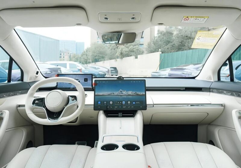Візуально новий Luxeed R7 Range extender не відрізняється від чисто електричної версії і зберігає обтічний дизайн. У його салоні встановлені овальне кермо та два дисплеї, а комплектація включає електропривід та масаж сидінь.